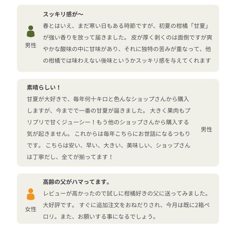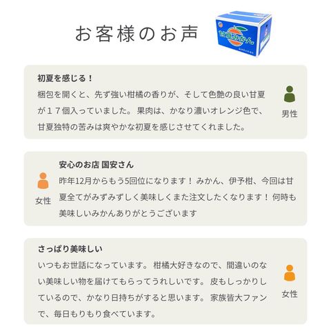 | 安心・安全 | 当店では、ノーワックス・防腐剤未使用の甘夏をお届けしております。 |