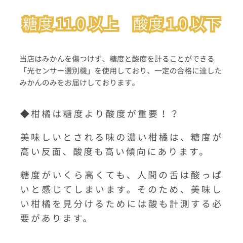 当店の光センサー選果は「みかんの糖度と酸度 (味品質) を測って、味のバランスを見極める "味センサー選果"」です。 |