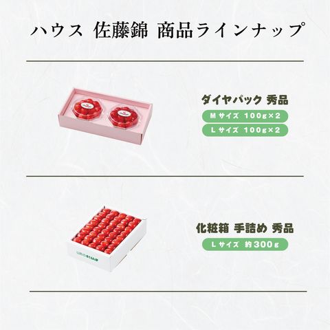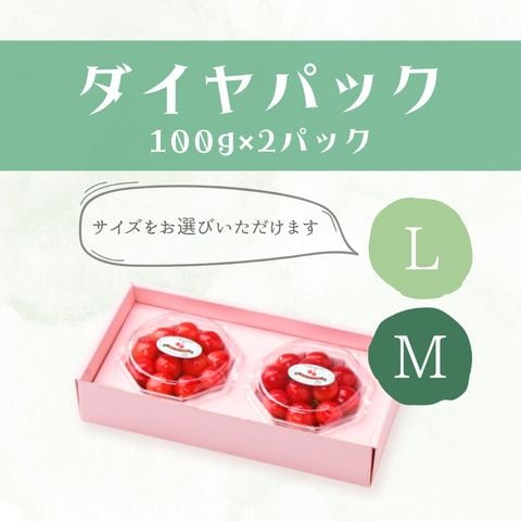 | 内容 | 山形産 さくらんぼ ◆3種類からお選びいただけます 【ダイヤパック 秀品 100g×2パック】 ┗ Mサイズ ┗ Lサイズ 【化粧箱手詰め 秀品 300g】 ┗ Lサイズ |