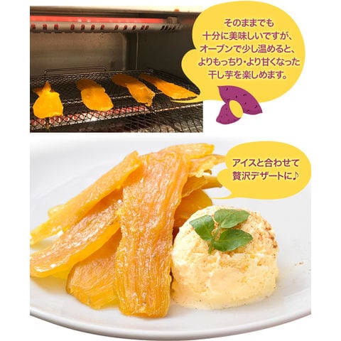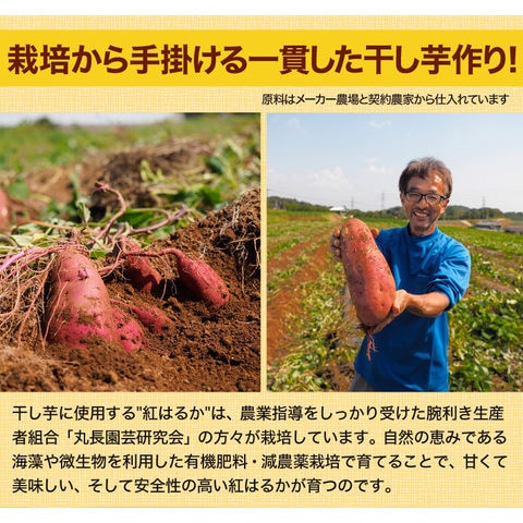 とっても甘くてもっちり食感! その理由は「貯蔵熟成期間」と「干し上げ方法」にあり! \甘さポイント/ 貯蔵熟成期間 干し芋作りに使われるサツマイモは、収穫後、甘さを高めるために貯蔵されるのが一般的です。今回の干し芋は、通常1週間ほどの貯蔵と言われるところ、なんと60日間も貯蔵しています。 また貯蔵の際に重要となる、温度・湿度を徹底管理しているため、原料の段階で相当甘いと言います!干し芋にする原料はBRIX12度以上を基準としています。 \甘さポイント/ 半生状態で仕上げる 完全に干し上げる一歩手前の「半生状態」で仕上げています。そのため、ちょうど良い具合に水分が残っており、もちもちっとした干し芋ならではの食感を楽しめるのです。 また室内での機械干しのため、天日干しの際リスクともなる異物混入も防ぎ、衛生面でも安心・安全の干し芋が出来上がるのです。 |