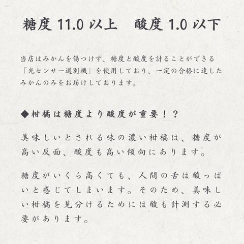 当店の光センサー選果は「みかんの糖度と酸度 (味品質) を測って、味のバランスを見極める "味センサー選果"」です。 |