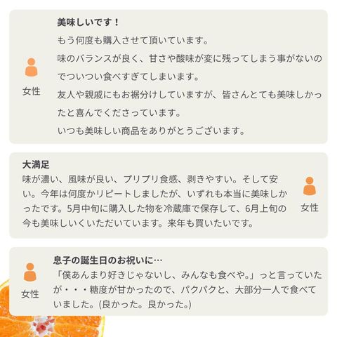 | 品質管理 | 当店では品質管理に万全を期すため、人手をかけ1つ1つ箱詰めしております。商品到着時に万一品質劣化、破損等ございましたら商品到着後2日以内に当店までご連絡いただければと存じます。状況に応じて対応策を検討させていただきます。 生もののため、お客様都合による返品は原則不可となります。 また、配送ご指定日に商品を受け取ることができなかった場合等、お客様側のご事情により生じた商品劣化・破損等については保証し兼ねますので予めご了承くださいませ。 |