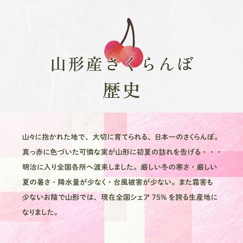 山形産さくらんぼ の美味しさの秘訣 梅雨時期に成熟期を迎えるさくらんぼですが、降水量の比較的少なく昼と夜の温度差が大きい山形では果物の糖度も高まり甘味や香りの強いさくらんぼが栽培されます。 各枝の果実の中で一番生育の良いものだけを残し栽培することで大きく立派な、伯味の濃いさくらんぼが育ちます。 不要と思われる枝や葉を落とし小さなさくらんぼに光が十分にあたるようにします。こうする事で実も大きく育ち、赤みが増したおいしいさくらんぼが育ちます。 【佐藤錦】 ・果肉が柔らかく、ジューシーで強い甘みと程よい酸味がある ・果皮は鮮やかなルビー色で光沢があり、宝石に例えられるほど美しい ・種が小さく、食べられる部分が多い ・大粒になるほど果肉が厚く果汁たっぷり ・プリプリのさくらんぼが口の中ではじける食感 |