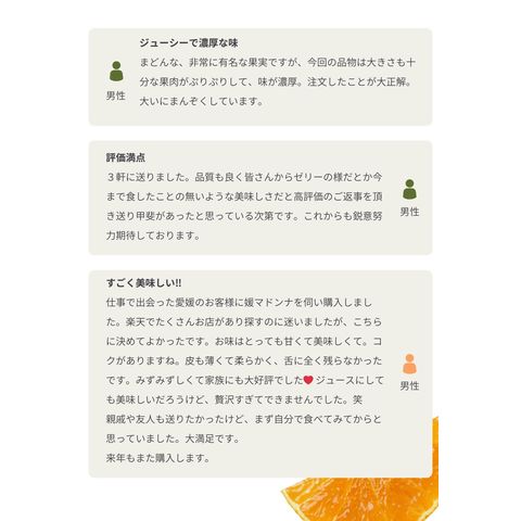 | 安心・安全 | 当店では、ノーワックス・防腐剤未使用の愛媛まどんなをお届けしております。 |