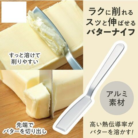 アルミの優れた熱伝導効果で、冷えて固まったバターでも軽い力で削って伸ばせるナイフ。