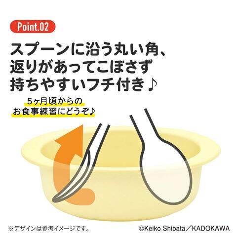 スプーンに沿う丸い角と返りがあってこぼさずすくいやすい形状。