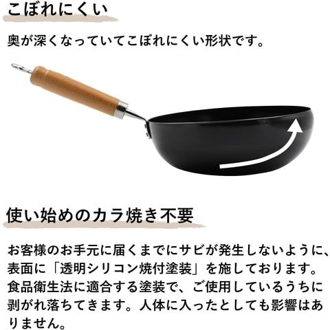 ■使い始めのカラ焼き不要 お客様のお手元に届くまでにサビが発生しないように、表面に「透明シリコン焼付塗装」を施しております。食品衛生法に適合する塗装で、ご使用しているうちに剥がれ落ちてきます。人体に入ったとしても影響はありません。