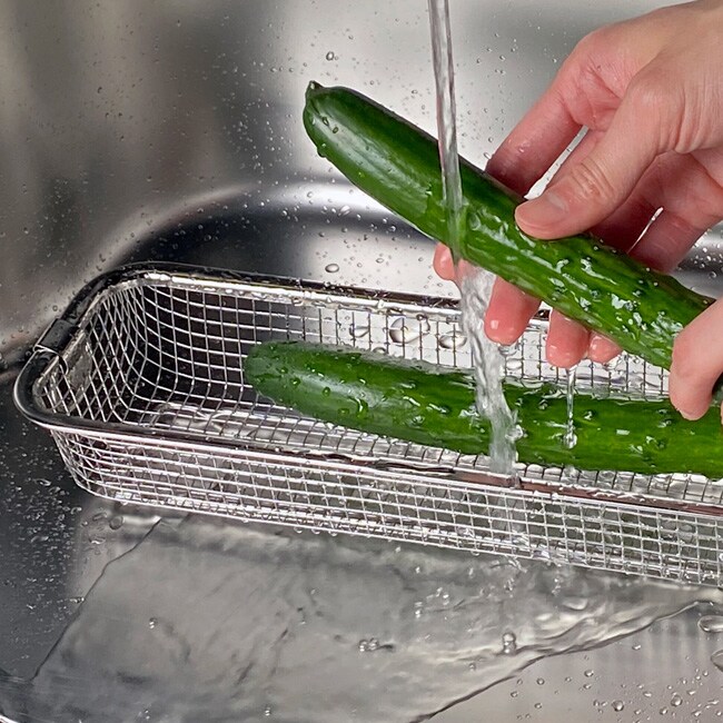 丸いザルでは洗いにくい、きゅうりやアスパラなどの長めの食材も洗いやすいです。