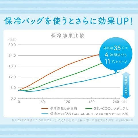 保冷効果(15 ℃ 以下)の目安 冷蔵庫で冷やした食材( 5 ℃ )を入れた場合外気温25 ℃で4時間程度