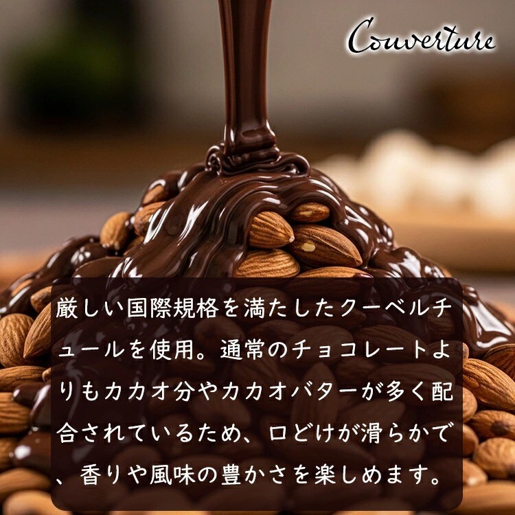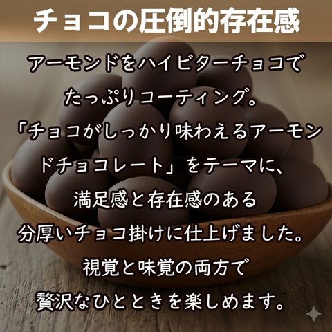チョコレート(カカオマス、砂糖、ココアバター)(国内製造)、アーモンド/乳化剤、香料、(一部に乳成分・アーモンド・大豆を含む) (※)本品製造工場では、小麦・卵・乳・くるみ・ピーナッツを含む製品を生産しています。 |