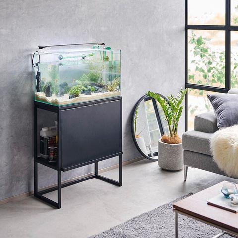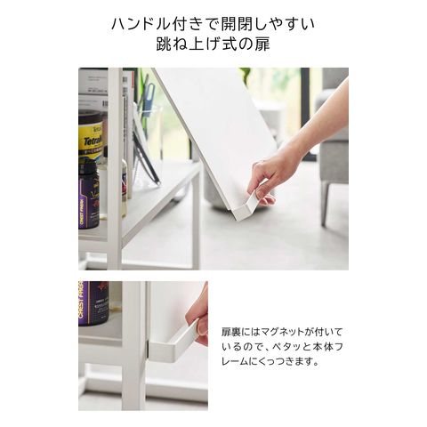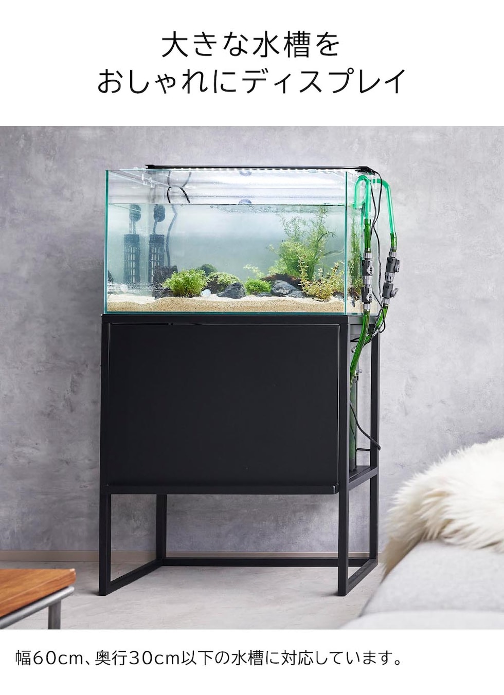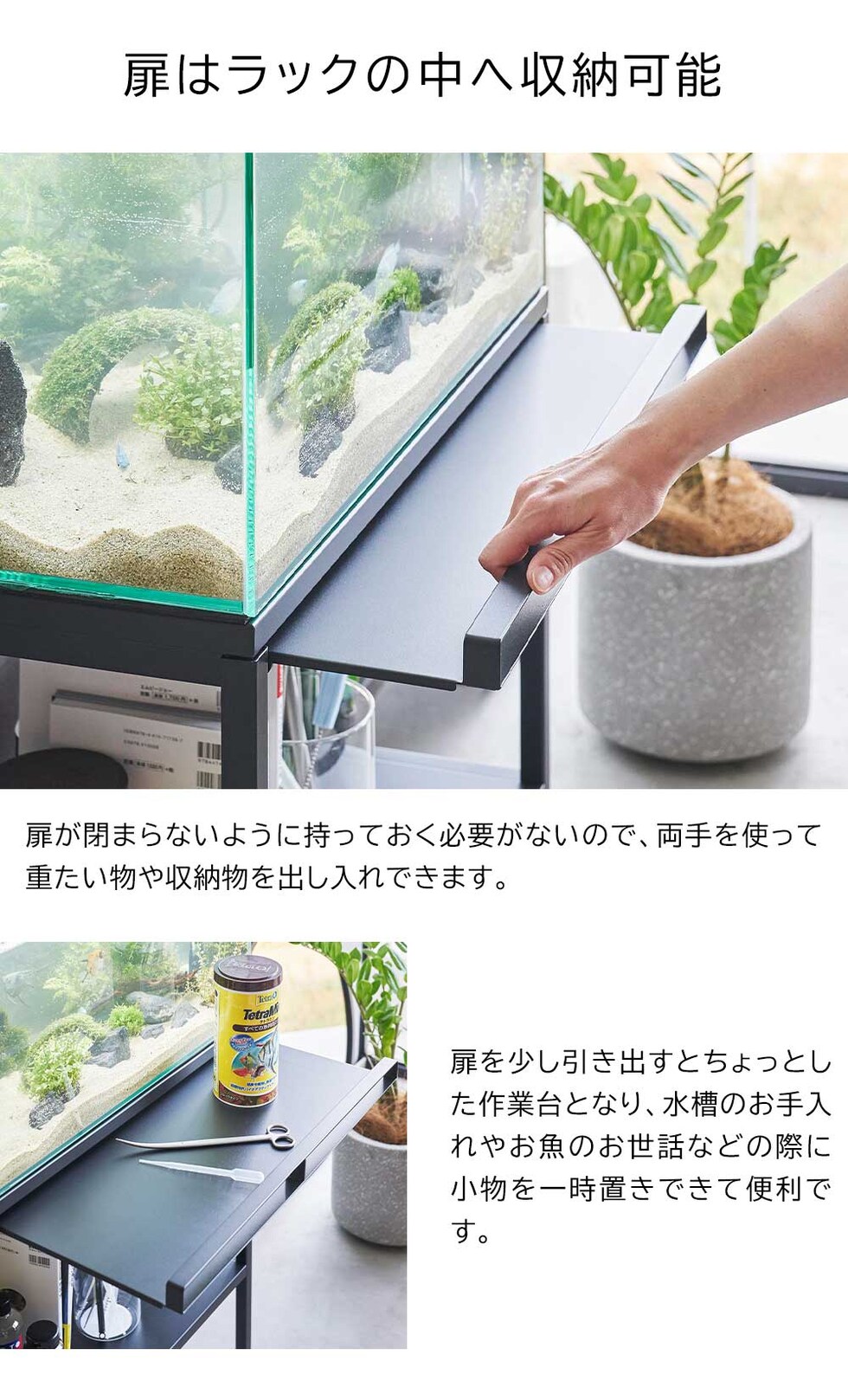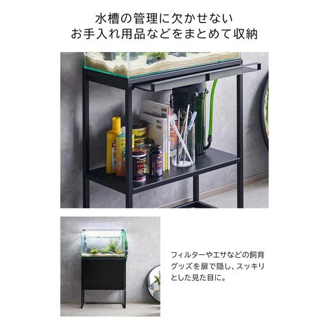 60cmサイズの水槽を飾れる、スチールのフレームがスタイリッシュな水槽ラック。ラック下段は収納棚になっており、フィルターやエサなどの飼育グッズをまとめて収納できます。収納棚の前にある跳ね上げ式の扉はマグネットでピタッと本体に固定されます。扉を閉めると生活感のないスッキリとした見た目に。開いた扉はラックの中にしまえるので、両手を使って重たい物や収納物を出し入れできます。扉を少し引き出すとちょっとした作業台となり、水槽のお手入れやお魚のお世話などの際に小物を一時置きできて便利です。どんな空間にも溶け込むシンプルなデザインなので、リビングや玄関などで水槽をおしゃれにディスプレイできます。