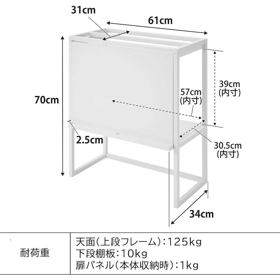 耐荷重 天面(上段フレーム):125kg 下段棚板:10kg 扉パネル(本体収納時):1kg |