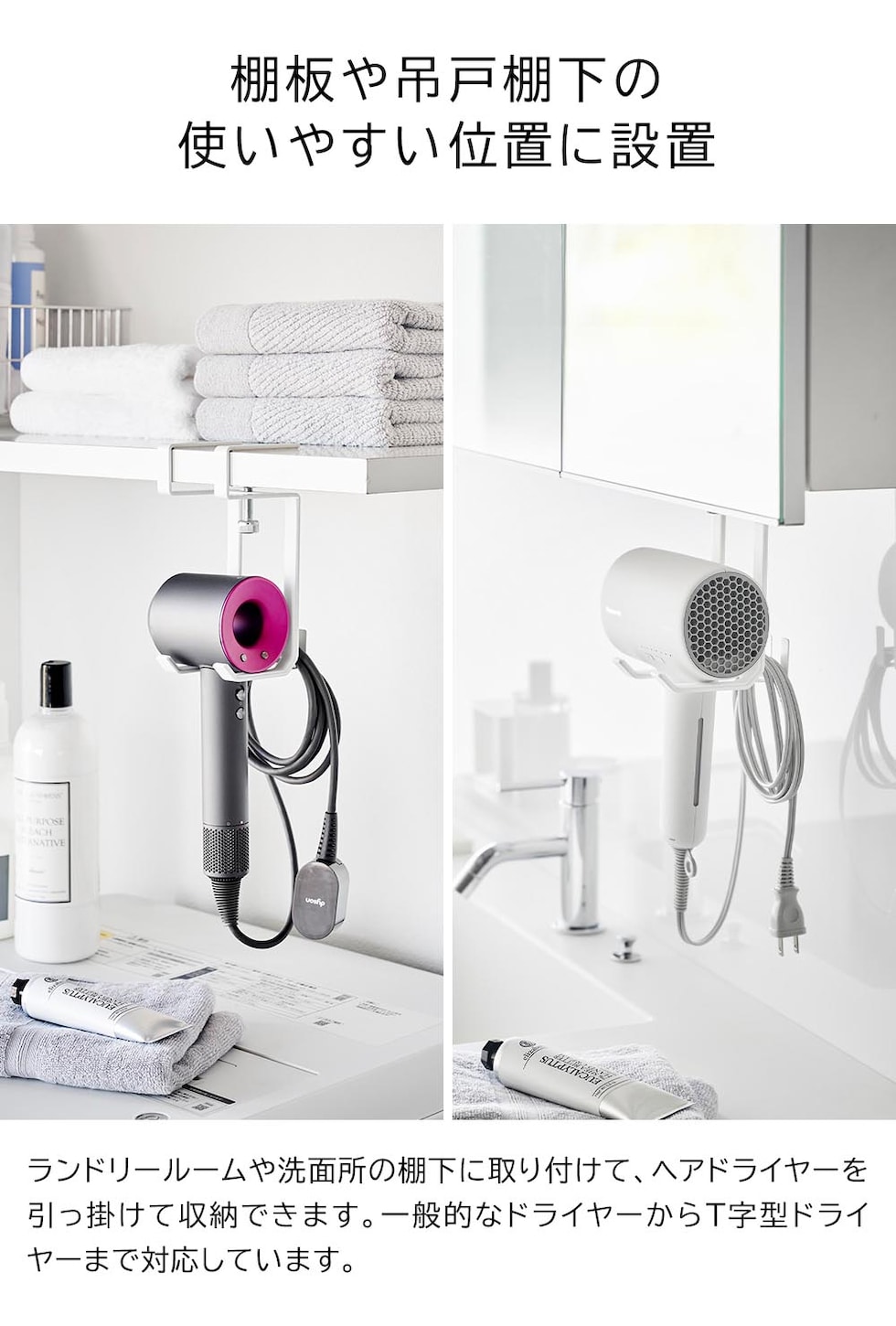 サッと手に取れる棚下に設置 ランドリールームや洗面所の棚下に取り付ける、ヘアドライヤーハンガーです。 棚板に挟み込みネジでしっかりと固定してドライヤーを引っ掛けるだけの簡単収納。使いたい時にすぐ取り出せて便利です。 一般的なドライヤーからT字型ドライヤーまで対応。ドライヤーの収納部には傷防止のシリコーンクッションが付いており、安心して収納できます。 背面に付属のコードホルダーを取り付ければ、ゴチャつく電源コードやプラグもスッキリまとめられます。 ![]() ![]() ![]() ![]() ![]() ![]() ![]() ![]() ![]() ![]() ![]() ![]() ![]() |
