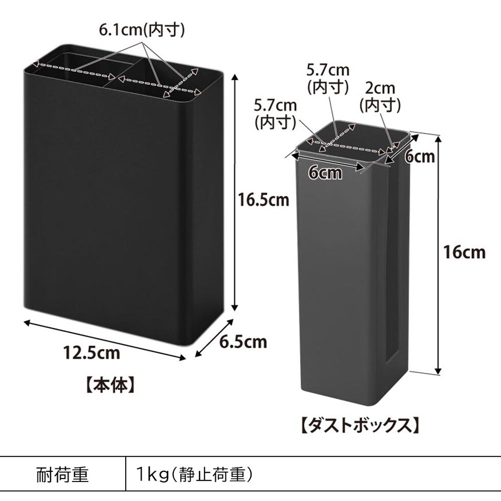 内寸サイズ 本体収納部:W6.1×D6.1×H16.4cm(仕切り1つあたり) ダストボックス収納部:W5.7×D5.7×H16cm スリット:W2cm |
