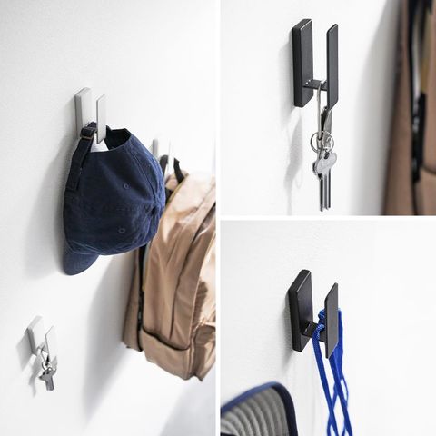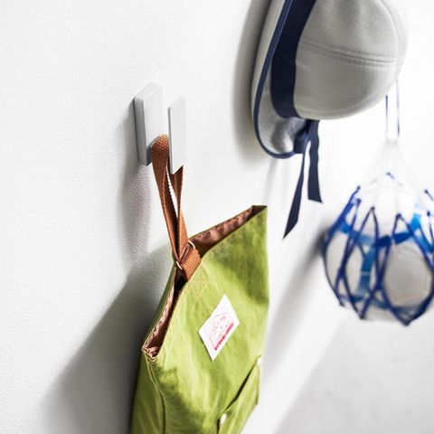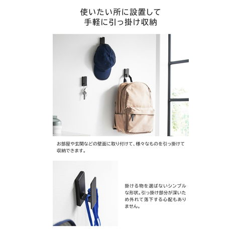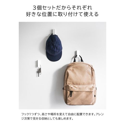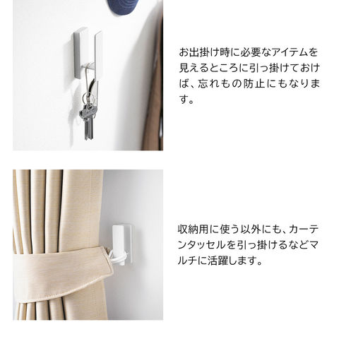 石こうボードピンで壁面設置 お部屋や玄関などの壁面に取り付けて手軽に引っ掛け収納ができるウォールフックです。 帽子やバッグ、鍵などの引っ掛け収納やカーテンをまとめるタッセルフックとしてなど、アイディア次第でマルチに使えます。 設置は、壁の穴が目立ちにくい石こうボードピンで簡単に取り付けられます。木ネジでの取り付けも可能。 設置場所も、引っ掛けるものも選ばないシンプルなデザインです。 |