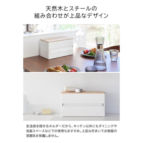 ロールタイプのキッチンペーパーを生活感を隠して収納できるキッチンペーパーホルダーです。 海外製の大きめロールにも対応するLサイズ。 本体はスチール製で安定感があるため、片手で引き出してサッとスムーズにカットできます。 シャフトに差し込んでホルダーにセットするから、コロコロと回転しやすく次のペーパーも取り出しやすい構造。 キッチンやダイニングの見える所に置いても映える、木とスチールが美しいデザインです。