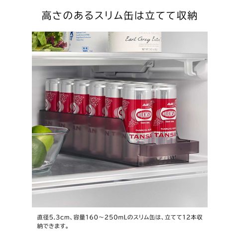 ■収納可能数 縦置き:12本(160~250mL缶/直径5.3cm) 横置き2段:12本(160~190mL缶/直径5.3cm) 9本(250・280mL缶/直径6.6cm) ※缶のサイズや形状により異なります。 |