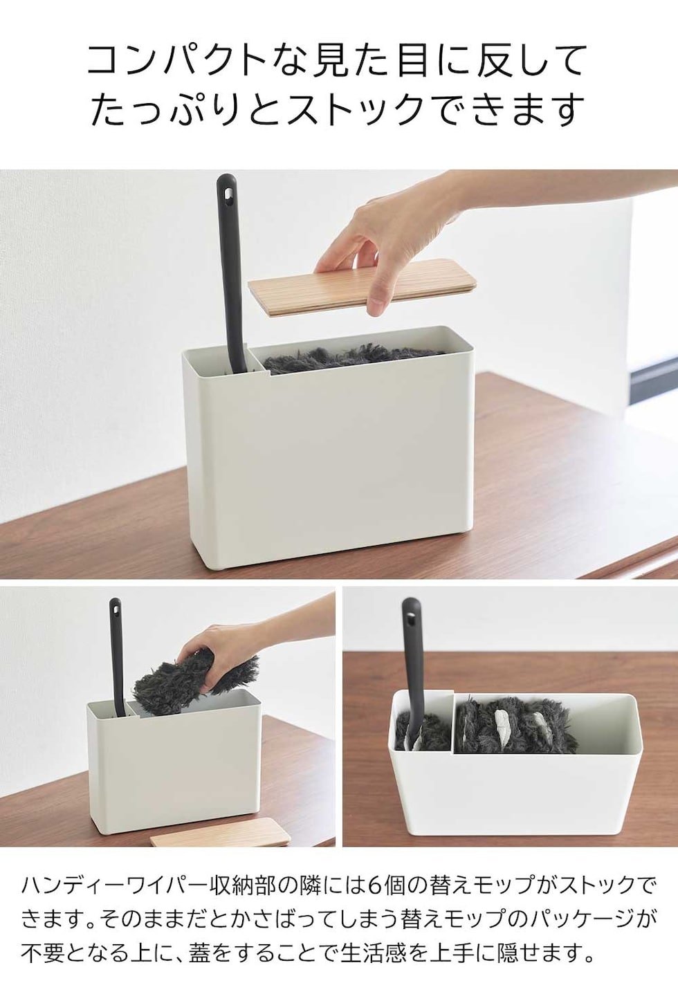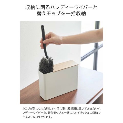 収納に困る ホコリが気になった時にすぐ手に取れる場所に置いておきたいハンディーワイパーを、替えモップと一緒にスタイリッシュに収納できるスタンドです。 ハンディーワイパー収納部の隣の蓋を開けると、6個の替えモップをストックできます。そのままだとかさばってしまう替えモップのパッケージが不要となる上に、蓋があるので見える場所に置いていても生活感を上手に隠せます。 天然木の蓋とモノトーンスチールの組み合わせが上品で、リビングにも馴染むデザイン。 底面には滑り止めが付いているので、スタンドの転倒を防ぎ、大切な家具の傷つきも防止します。 ![]() ![]() ![]() ![]() ![]() ![]() ![]() ![]() ![]() ![]() ![]() ![]() |
