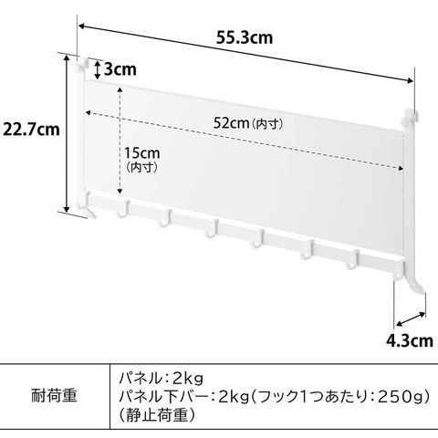 耐荷重 パネル:2kg パネル下バー:2kg(フック1つあたり:250g) (静止荷重) |
