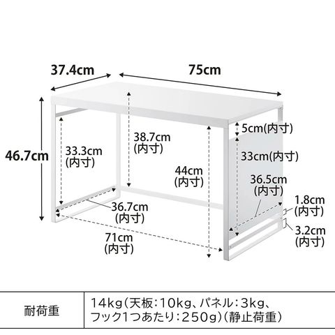 耐荷重 14kg(天板:10kg パネル:3kg フック1つあたり:250g)(静止荷重) |