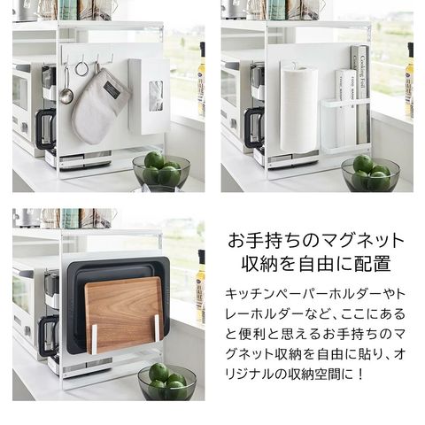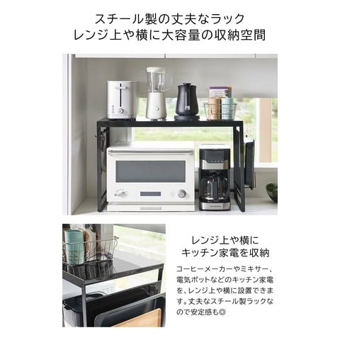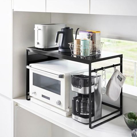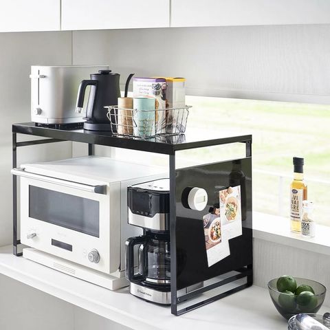 オーブンレンジの周辺には置いておきたいキッチンアイテムが盛り沢山!こちらのレンジラックを設置すれば、オーブンレンジまわりのデッドスペースを有効活用して収納量UP!キッチン家電やキッチンツール、お茶セットなど、細々とした物をスッキリと収納できます。