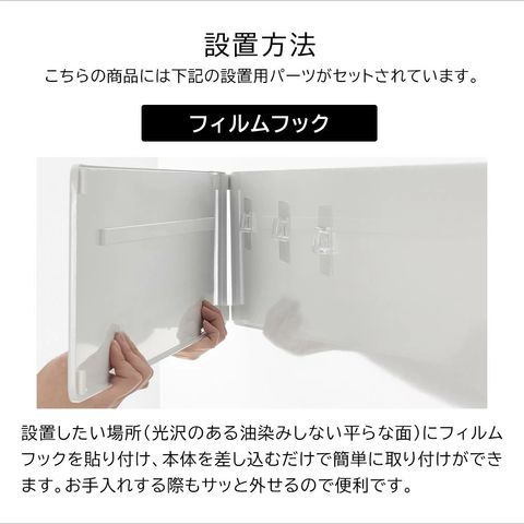 ■使用できる面 光沢のある平らな油染みしない面で、フィルムフックの接着面よりも大きい面(タイル・プラスチック・金属塗装面・人工大理石) |