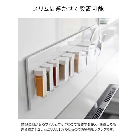 綺麗に剥がせるフィルムフックなので賃貸でも気軽に使え、厚み1.2cmとスリムに設置できます。