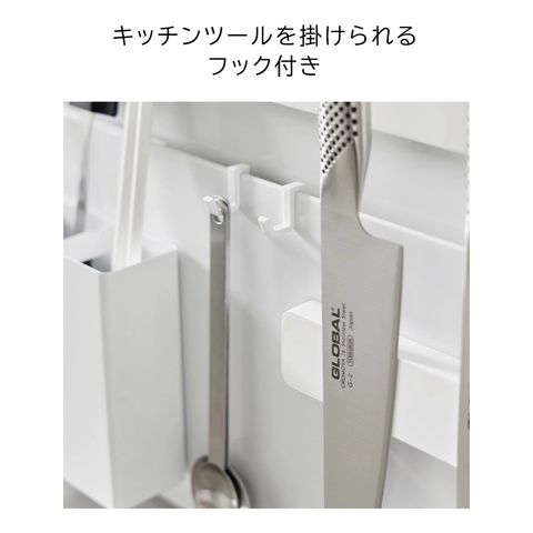 付属のフックにキッチン小物を掛ければ更に収納力アップ。