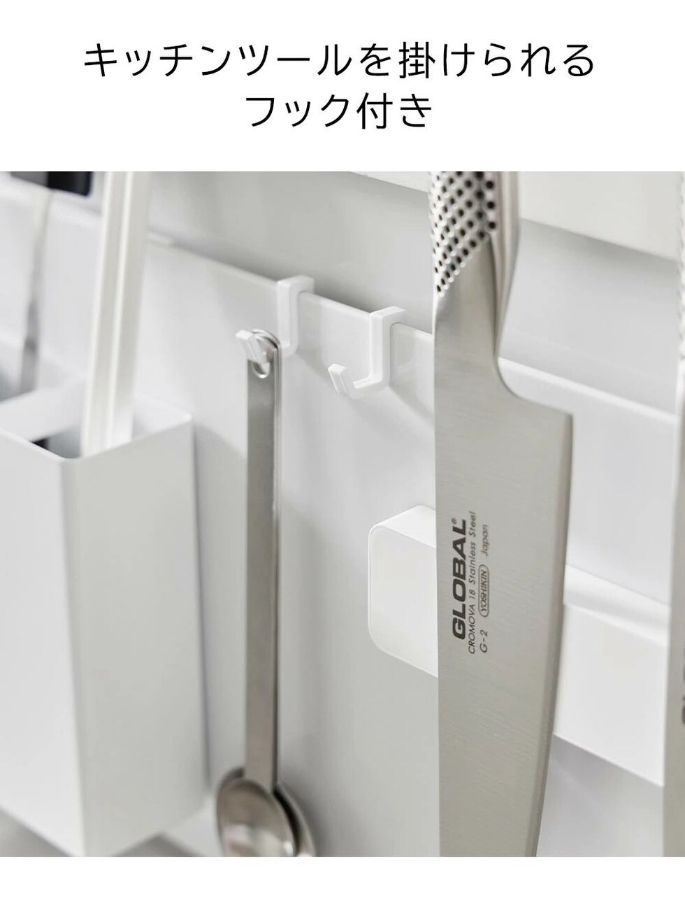 付属のフックにキッチン小物を掛ければ更に収納力アップ。