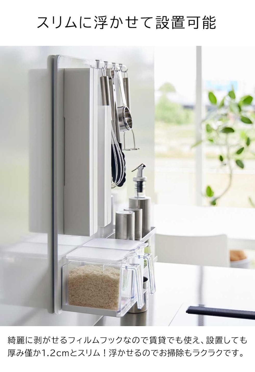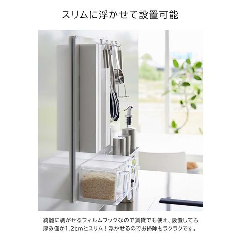 綺麗に剥がせるフィルムフックなので賃貸でも気軽に使え、厚み1.2cmとスリムに設置できます。