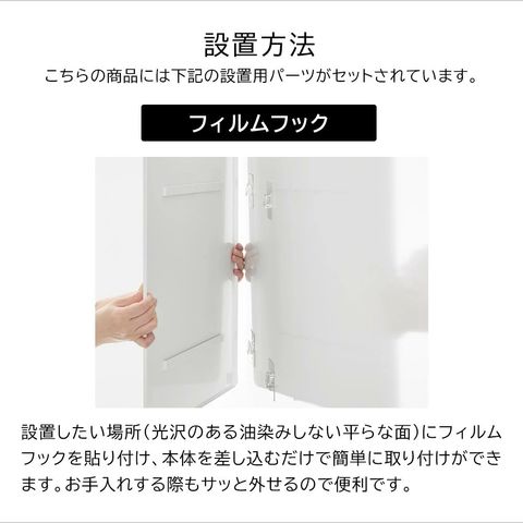 ■使用できる面 光沢のある平らな油染みしない面で、フィルムフックの接着面よりも大きい面(タイル・プラスチック・金属塗装面・人工大理石) |