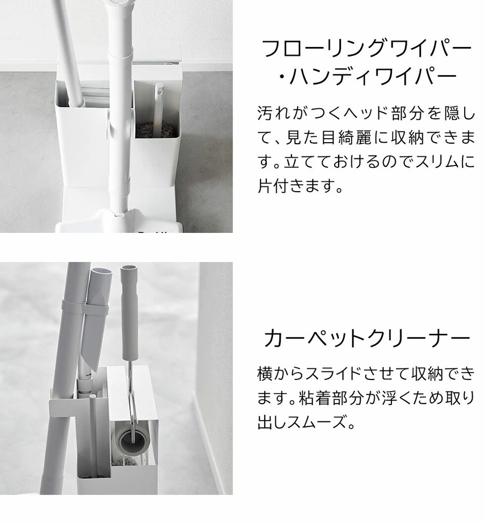 対応サイズ 収納可能サイズ ●スティッククリーナーヘッド:12.5cm以内 パイプ:直径4cm以内・高さ30cm以上 ●ハンディワイパーのヘッド:幅7.5×奥行5cm×高さ18cm以内 ●フローリングワイパーのヘッド:幅12cm×奥行5cm×高さ26cm以内 ●ハンディカーペットクリーナーのヘッド:幅16cm×直径6.5cm以内 |