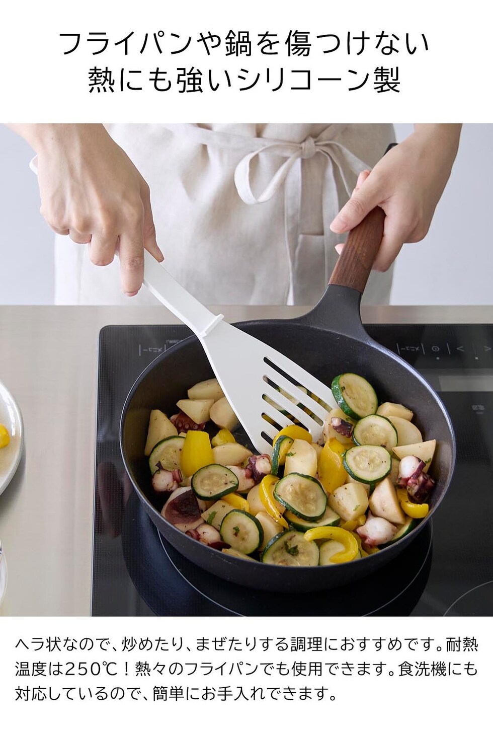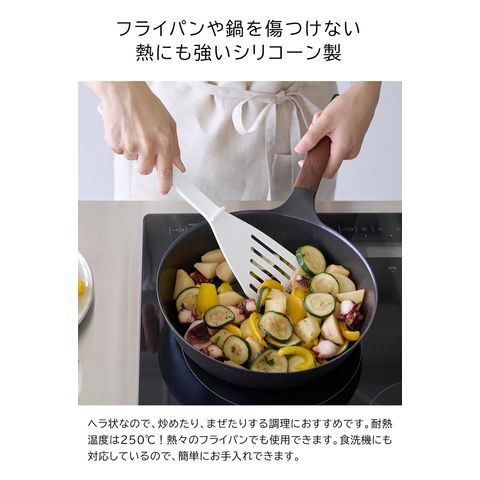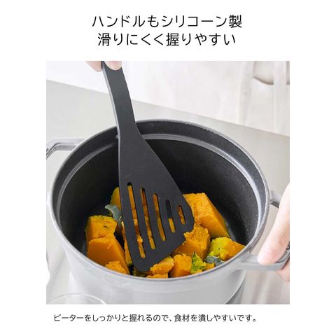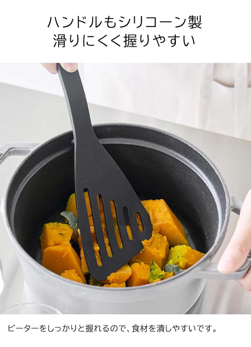 フライパンや鍋に優しく フライパンや鍋を傷つけないシリコーン製のビーター。 炒めたりまぜたりする調理におすすめです。 シリコーンハンドルは滑りにくく握りやすいので、食材を潰す調理でもしっかりと力を伝えられます。 また、ターナーのようにすくったり、ひっくり返すこともできます。 先端が浮くので、直置きにならずに衛生的。一時置きに便利です。 熱に強く、食洗機で洗えます。 ![]() ![]() ![]() ![]() ![]() ![]() ![]() ![]() ![]() ![]() |