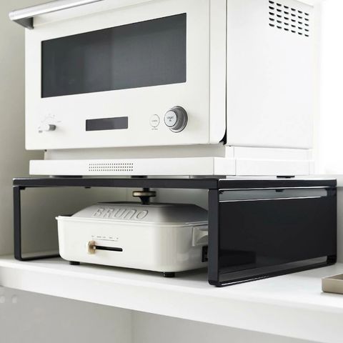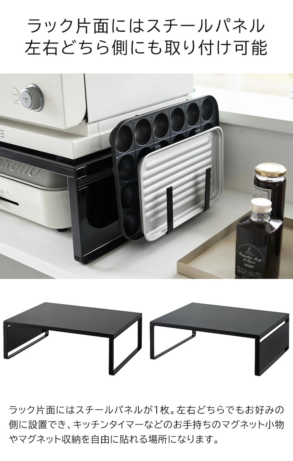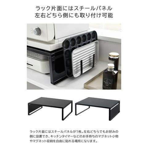 ホットプレートやカセットコンロなどの、大きくて置き場所に困るアイテムを、レンジ下に収納できるオーブンレンジラックです。レンジ上の縦のスペースを利用することで、新たな収納場所を探す必要がなくなり、また、出し入れしやすい場所にスマートに収納できます。 フレーム片面にはスチールパネルがついているので、お手持ちのマグネット収納グッズやキッチンタイマーなどのマグネット小物を自由に貼れます。スチールパネルが左右どちら側にも設置できるのも◎ スチール製の頑丈なラックで安定感があり、見た目もシンプルでスマート。機能的なオリジナル収納が手軽に作れます。