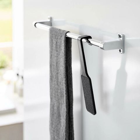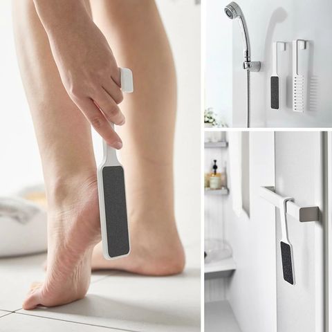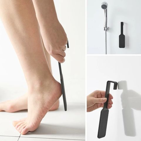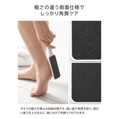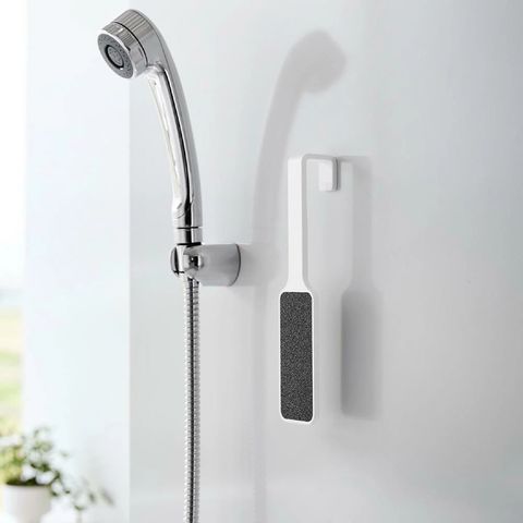 マグネットでお風呂場の壁に貼り付けて収納できるかかとやすりです。 浮かせる収納で風通しが良く、乾きが早くなるので、ぬめらず清潔を保てます。 また、持ち手部分がフック状になっており、タオルバーやランドリーパイプなどに引っ掛けて収納もできます。 やすり部分は両面仕様となっており、粗い面と細かい面を使い分けて角質を除去し、かかとのケアができます。