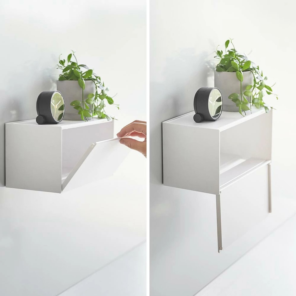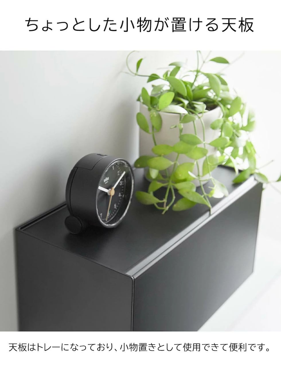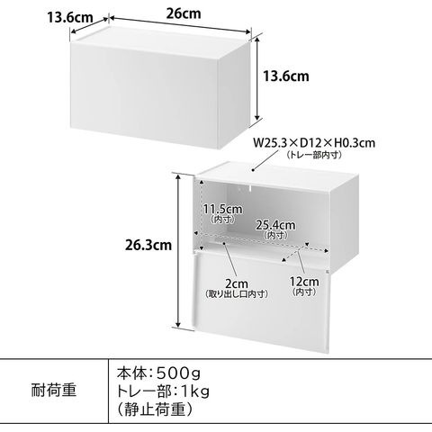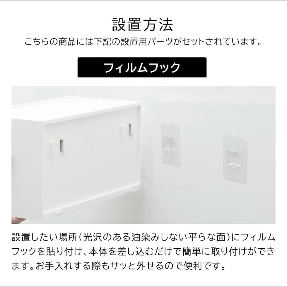 商品サイズ 本体:W26×D13.6×H13.6cm 蓋開口時:H26.3cm フィルムフック接着面:W6×H6cm(1つあたり) |