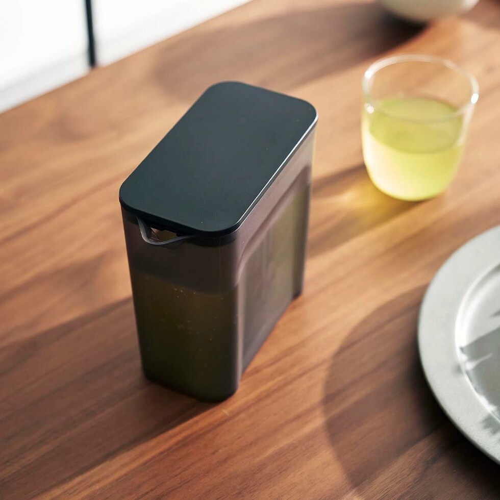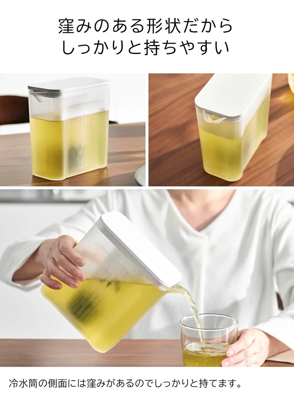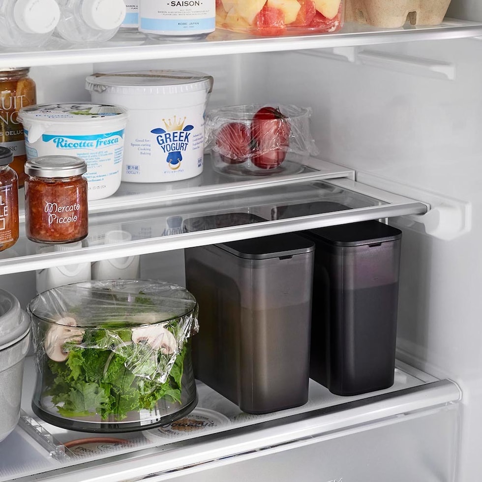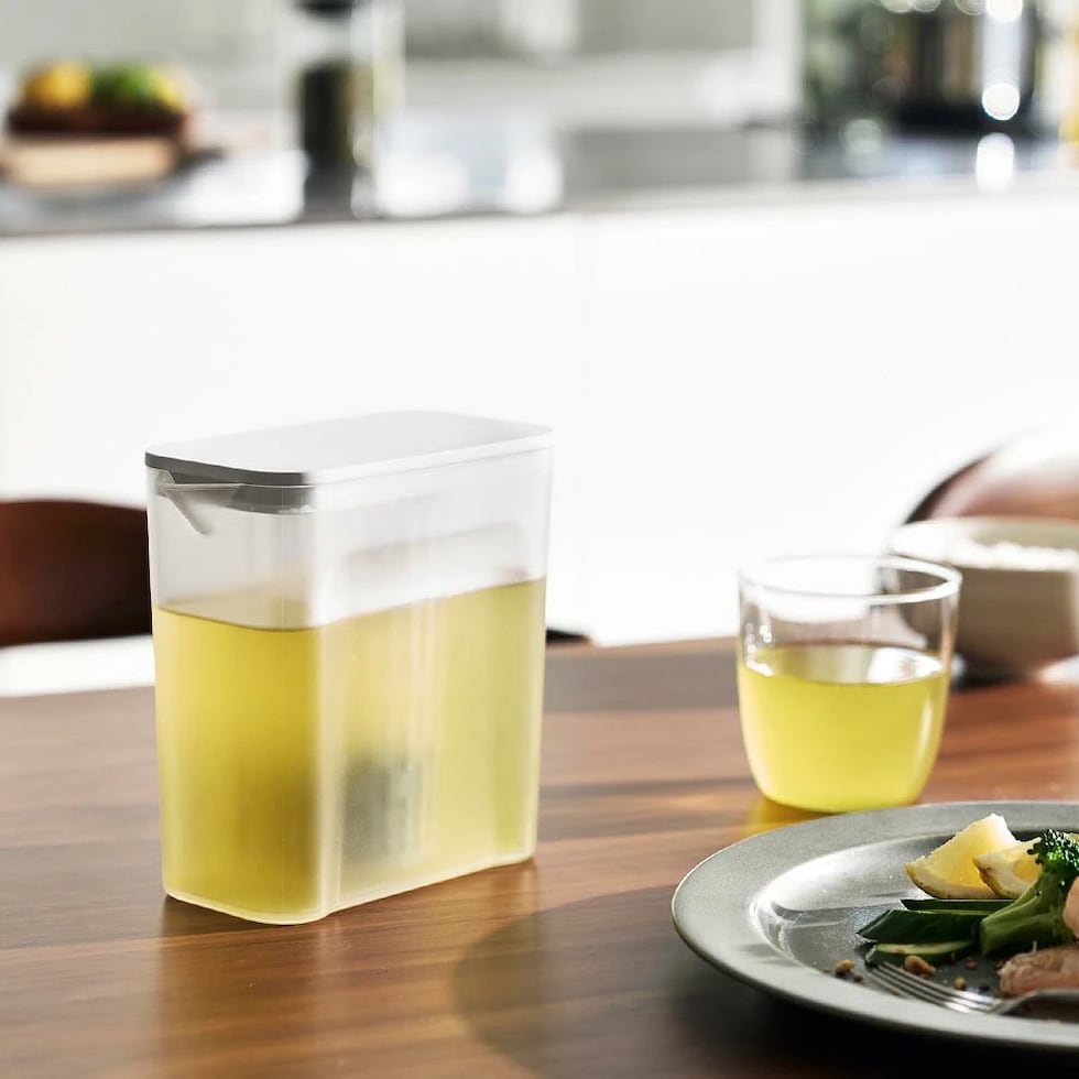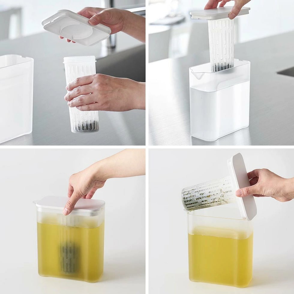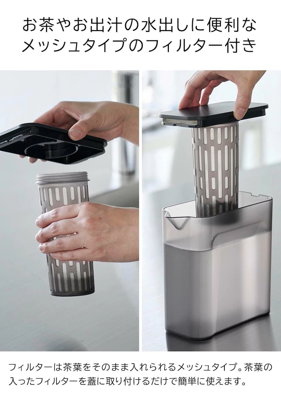 冷蔵庫の棚とドアポケットの両方に収まるコンパクトな冷水筒です。茶葉をそのまま入れられるメッシュタイプのフィルター付き。茶葉を入れたフィルターを蓋に取り付けるだけで簡単に使えます。フィルターが底まで届くので少量の水でも抽出が可能。お好みの濃さになったら、蓋を引き上げて容器の縁に掛けておくと、最後の一滴まで注ぎきることができます。お茶だけでなく、お出汁を水出しする際にも便利です。