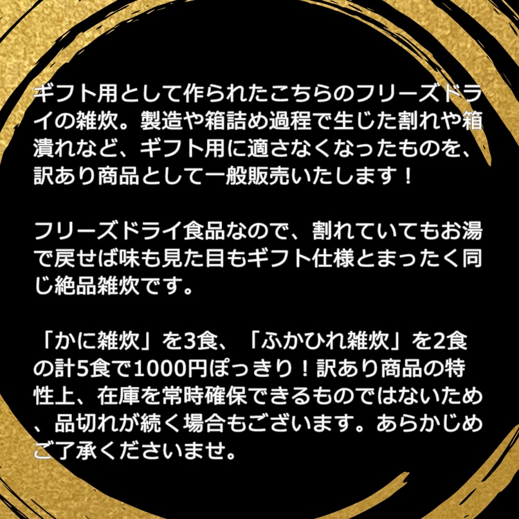 訳あり フリーズドライ 雑炊 2種類 5食 セット かに雑炊 ふかひれ雑炊 蟹雑炊 フカヒレ雑炊 即席 バラエティ 保存食 非常食 防災 お試し おためし 買い回り かに 蟹 ふかひれ 鱶鰭 福袋 お粥 粥 [Y3C]【ゆうパケットなら送料無料】