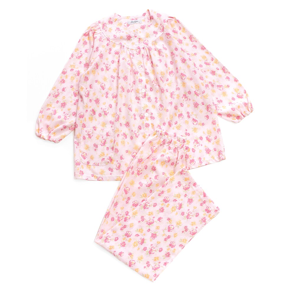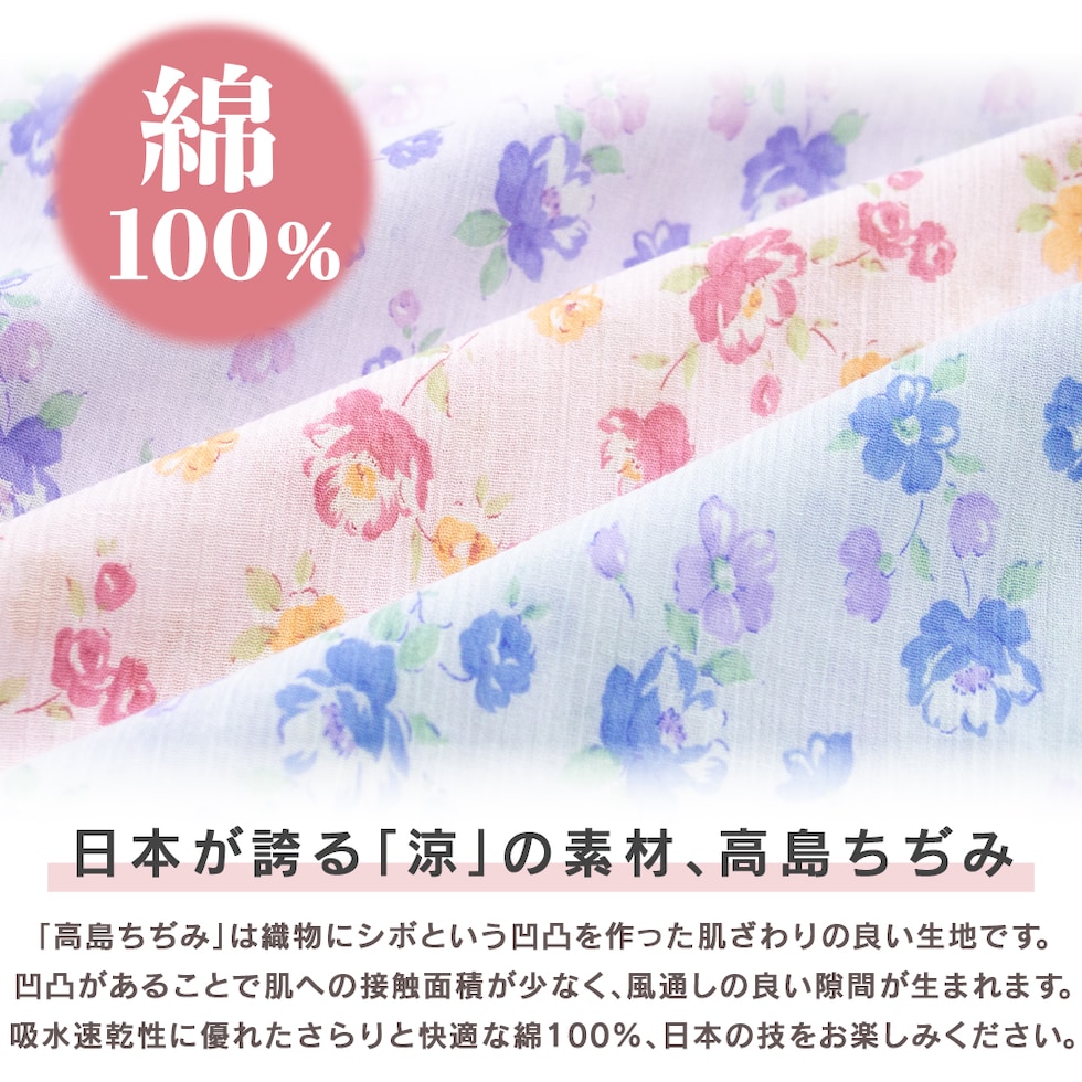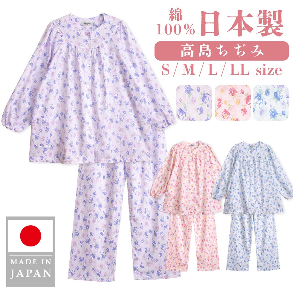 日本製 綿100% 高島ちぢみ レディース パジャマ フェミニン ラグラン 長袖 秋 春 花柄 ピンク サックス パープル S M L LL ギフト 母の日 敬老の日 送料無料