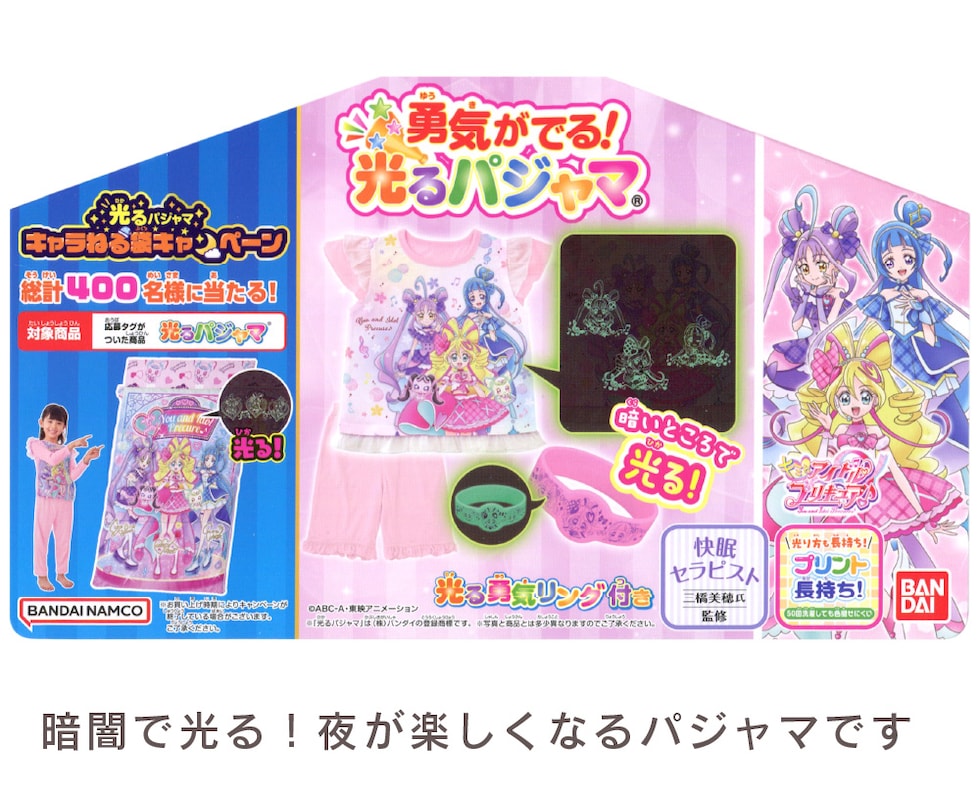 キミとアイドルプリキュアの、寝ても覚めても光るパジャマが登場しました。 薄くて軽くのびのび快適!長袖Tシャツとハーフパンツのセットパジャマです。 光る勇気リング付きで暗いところも怖くない! 暗い部屋では、プリキュア達が光ります!お着替えを嫌がったりまだ寝たくないお子様、電気を消すのや一人で寝るのが苦手なお子様のおやすみを応援するパジャマです。 プレゼントにもおすすめ♪ |