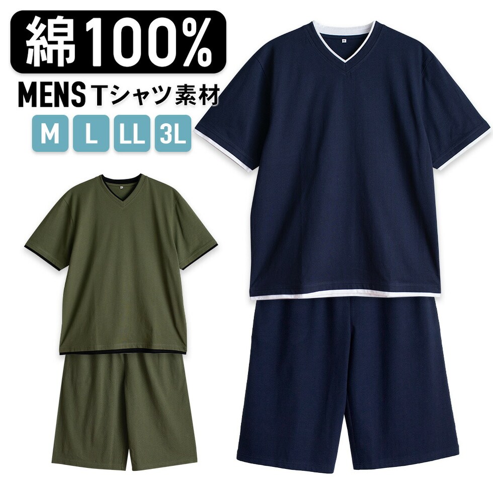 パジャマ メンズ 綿100% 半袖 春 夏 柔らかく軽い薄手の快適Tシャツ 上下セット Vネック ネイビー ブルー M L LL 3L 部屋着 スウェット ルームウェア おそろい 敬老の日