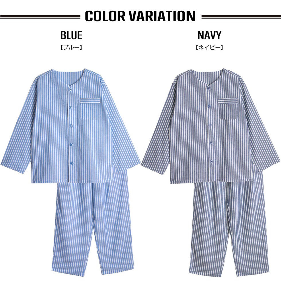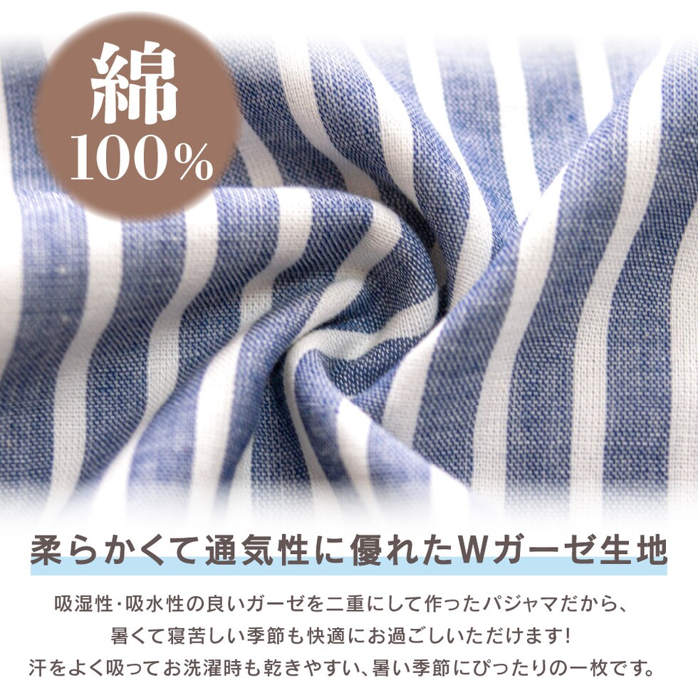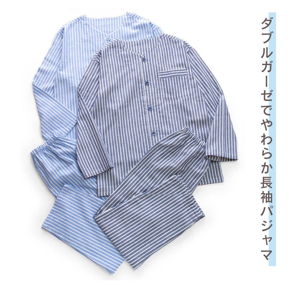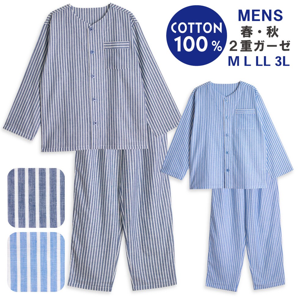 パジャマ メンズ 紳士 綿100% ダブルガーゼ 長袖 春 秋 前開き ストライプ ブルー ネイビー M L LL 3L 家族 おそろい