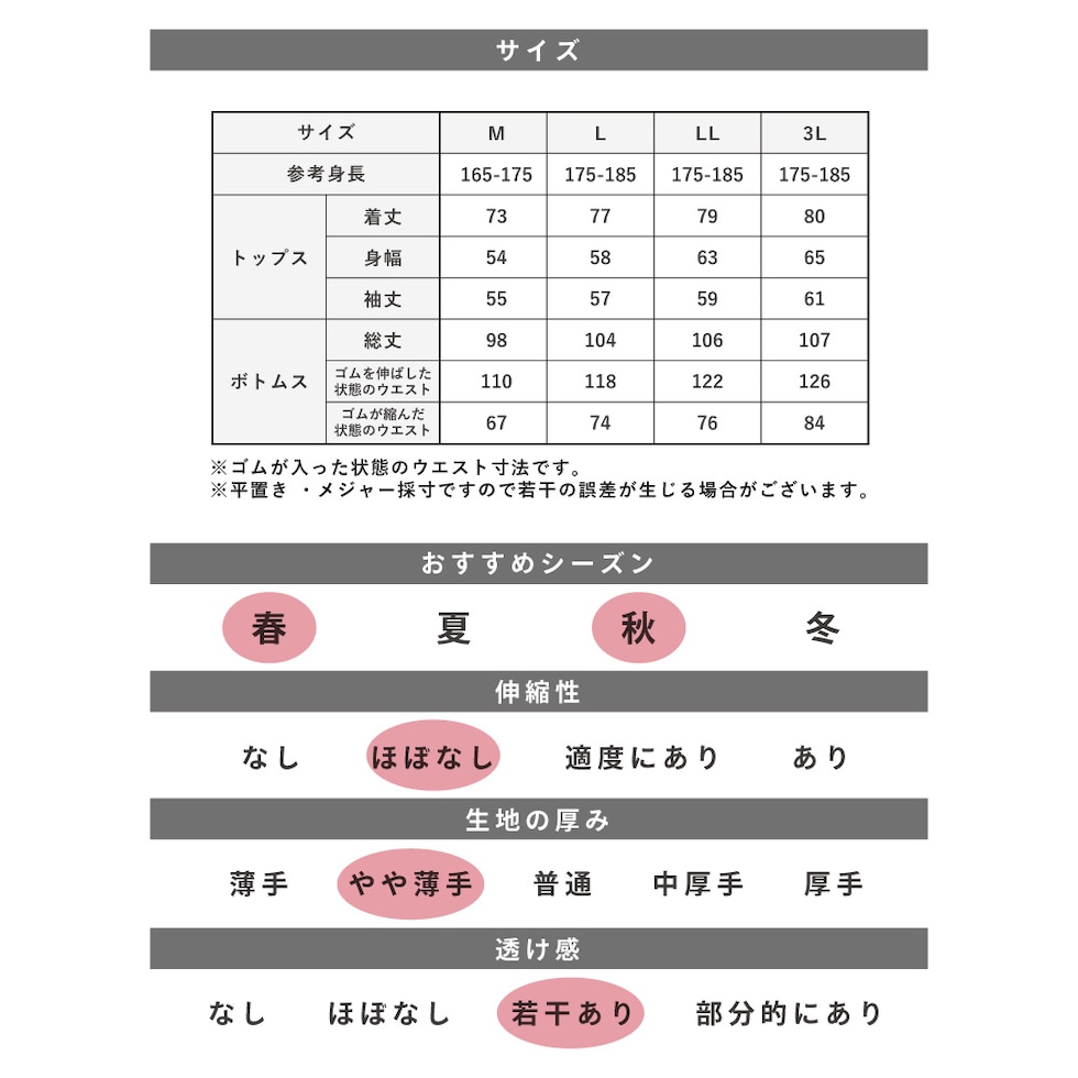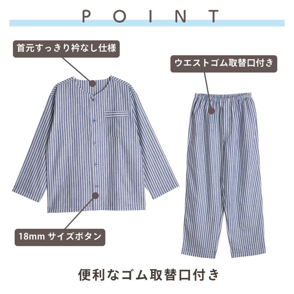トップス仕様:長袖/丸首・クルーネック パンツ仕様 :長パンツ/ウエスト総ゴム/ゴム取替口 |