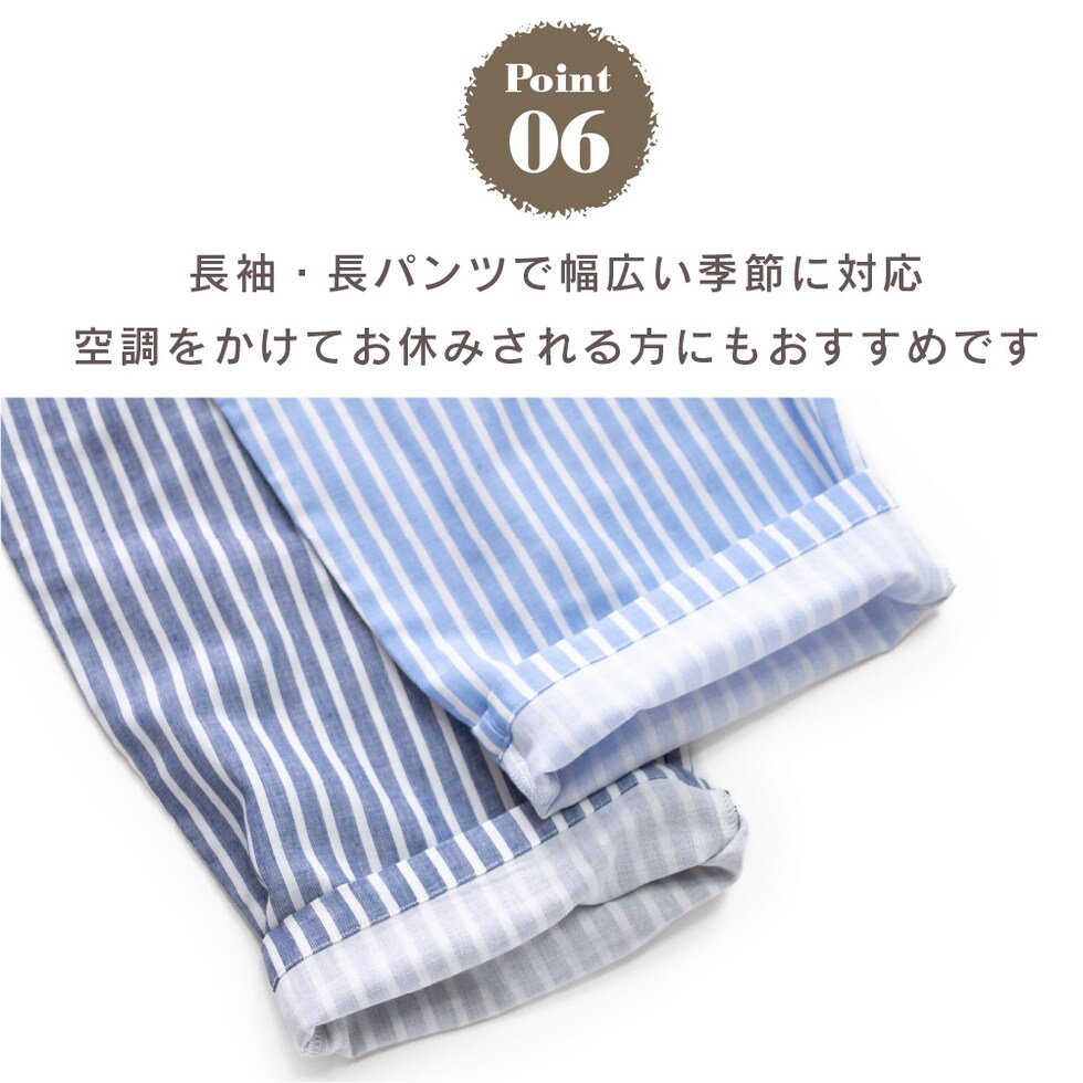 春・秋に丁度良い厚さの綿100%しっかり素材 吸湿性・吸水性の良いガーゼを二重にして作ったパジャマだから、 暑くて寝苦しい季節も快適にお過ごしいただけます! 汗をよく吸ってお洗濯時も乾きやすい、暑い季節にぴったりの一枚です。 同柄でキッズ、レディースもご用意しました。 家族でおそろいリンクコーデが楽しめます |