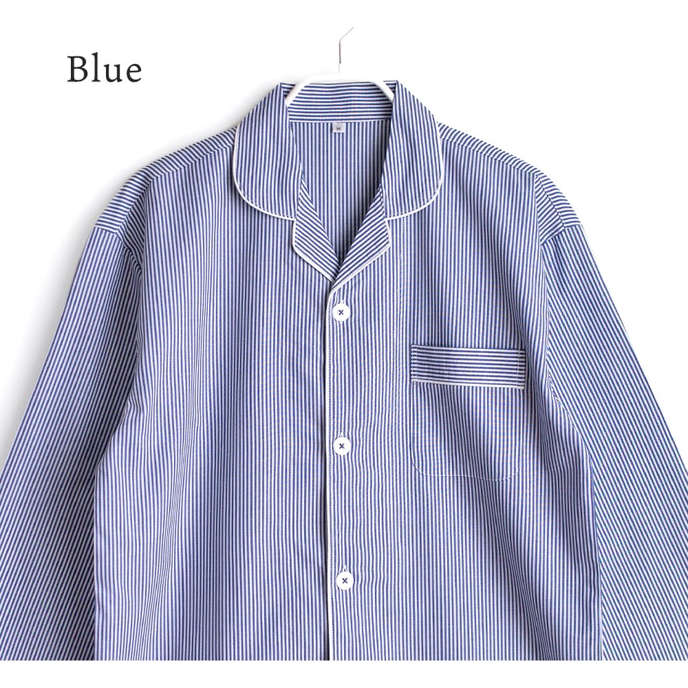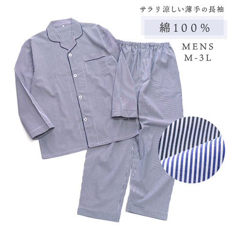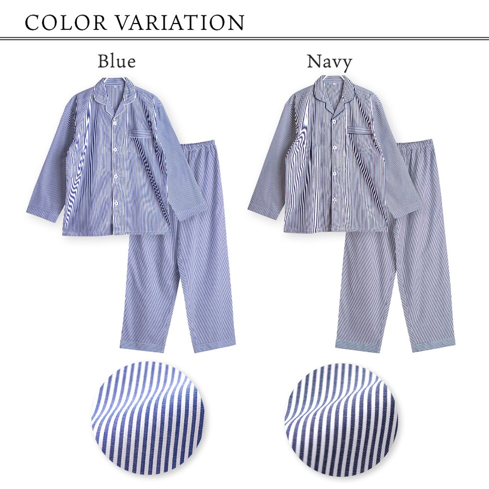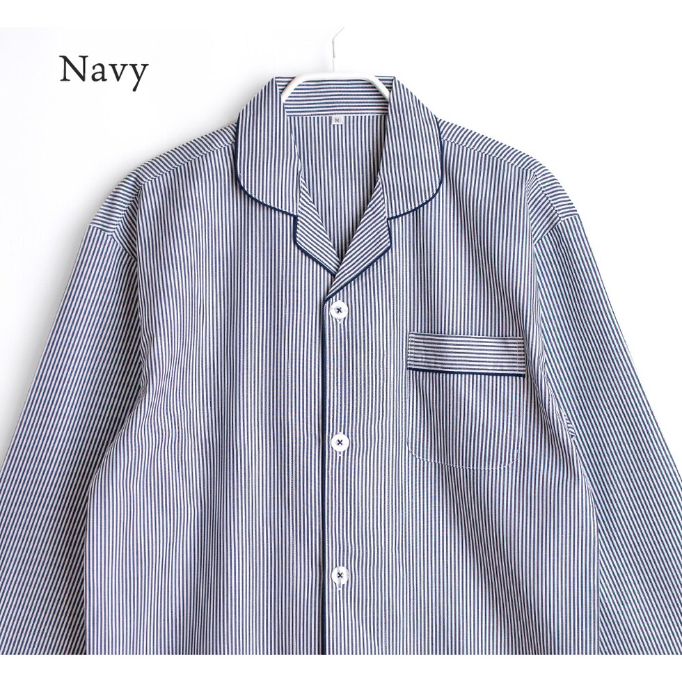 パジャマ メンズ 綿100% 長袖 春 夏 前開き シャツ 細ストライプ テーラー 前開き シャツ ネイビー ブルー M L LL 3L 先染め おそろい プレゼント 父の日