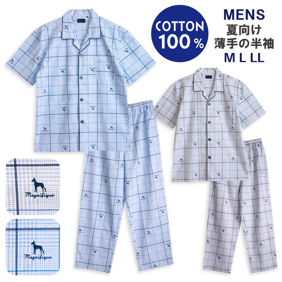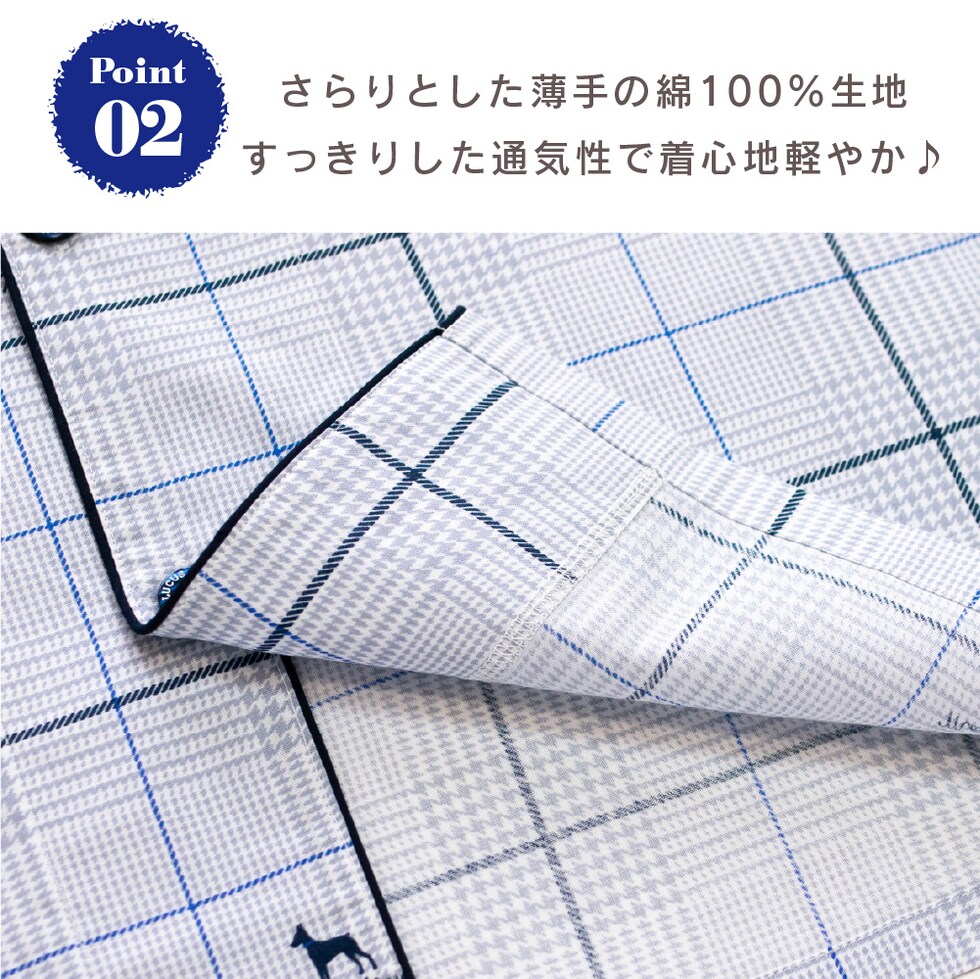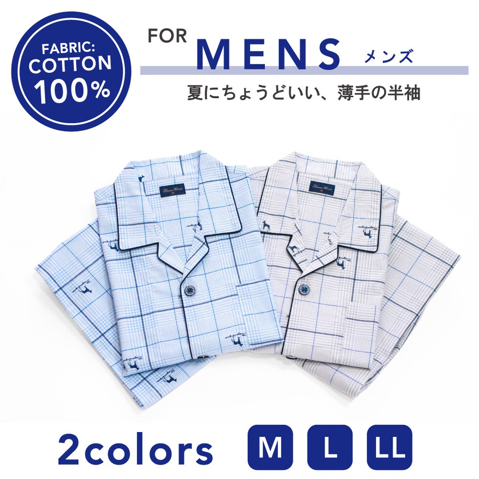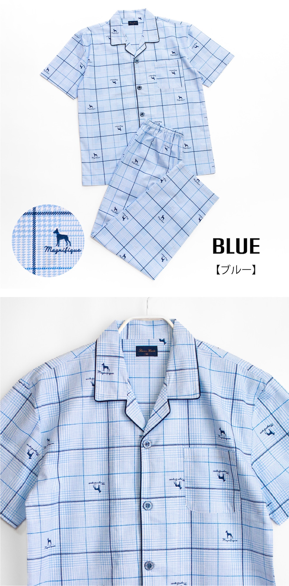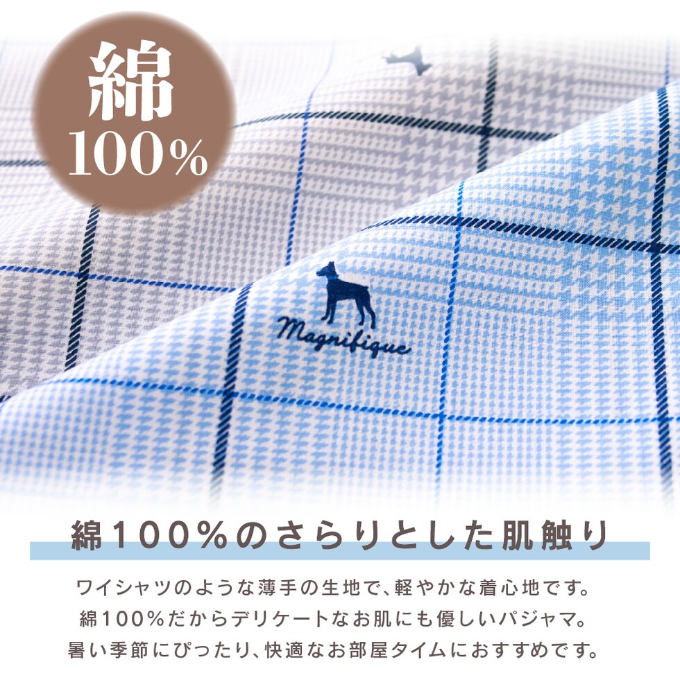 パジャマ メンズ 綿100% 半袖 夏向け 前開き グレンチェック 犬柄 薄手のシャツ ブルー グレー M L LL プレゼント 父の日