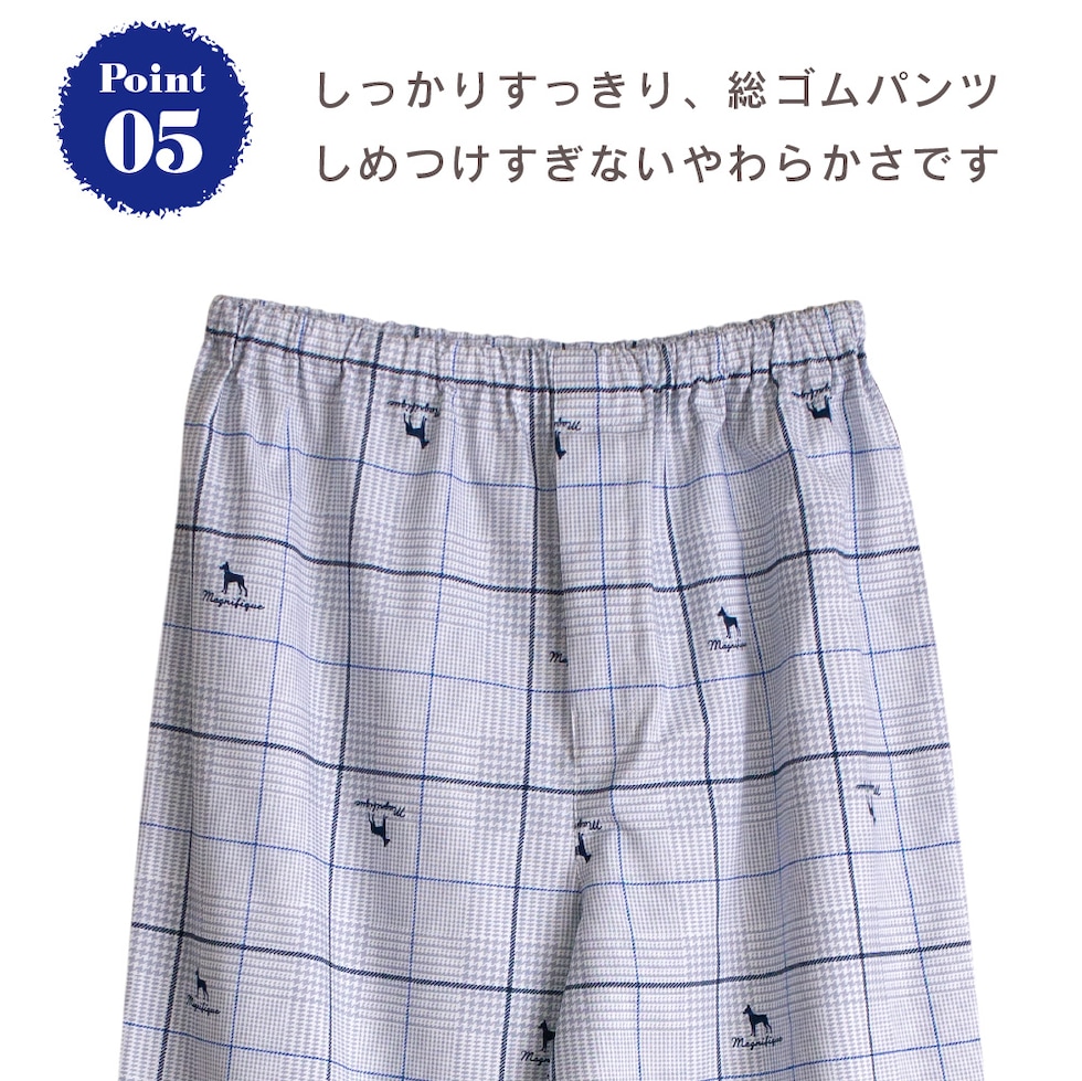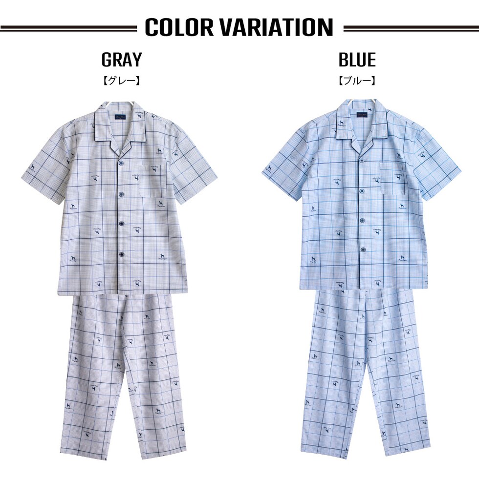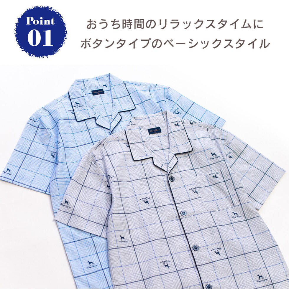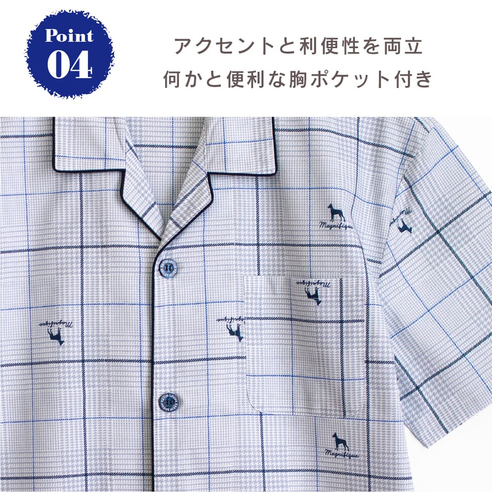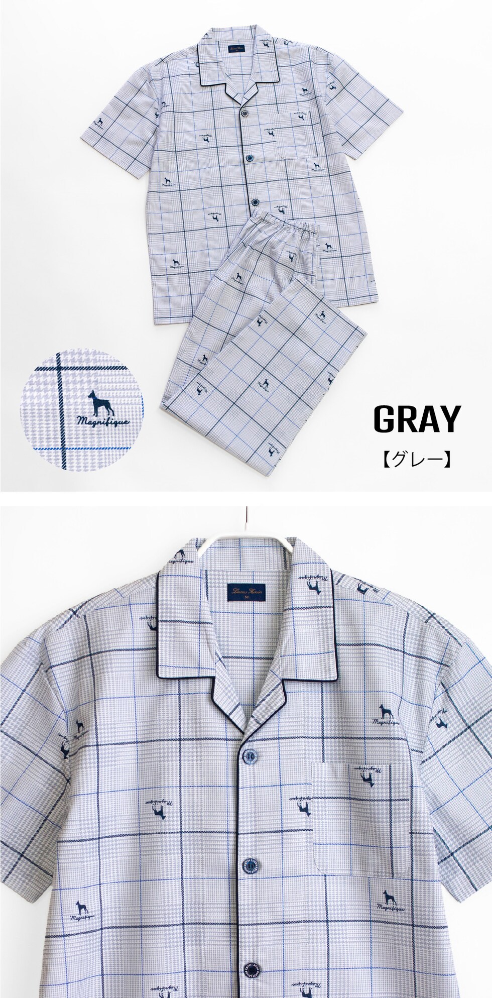パジャマ メンズ 綿100% 半袖 夏向け 前開き グレンチェック 犬柄 薄手のシャツ ブルー グレー M L LL プレゼント 父の日