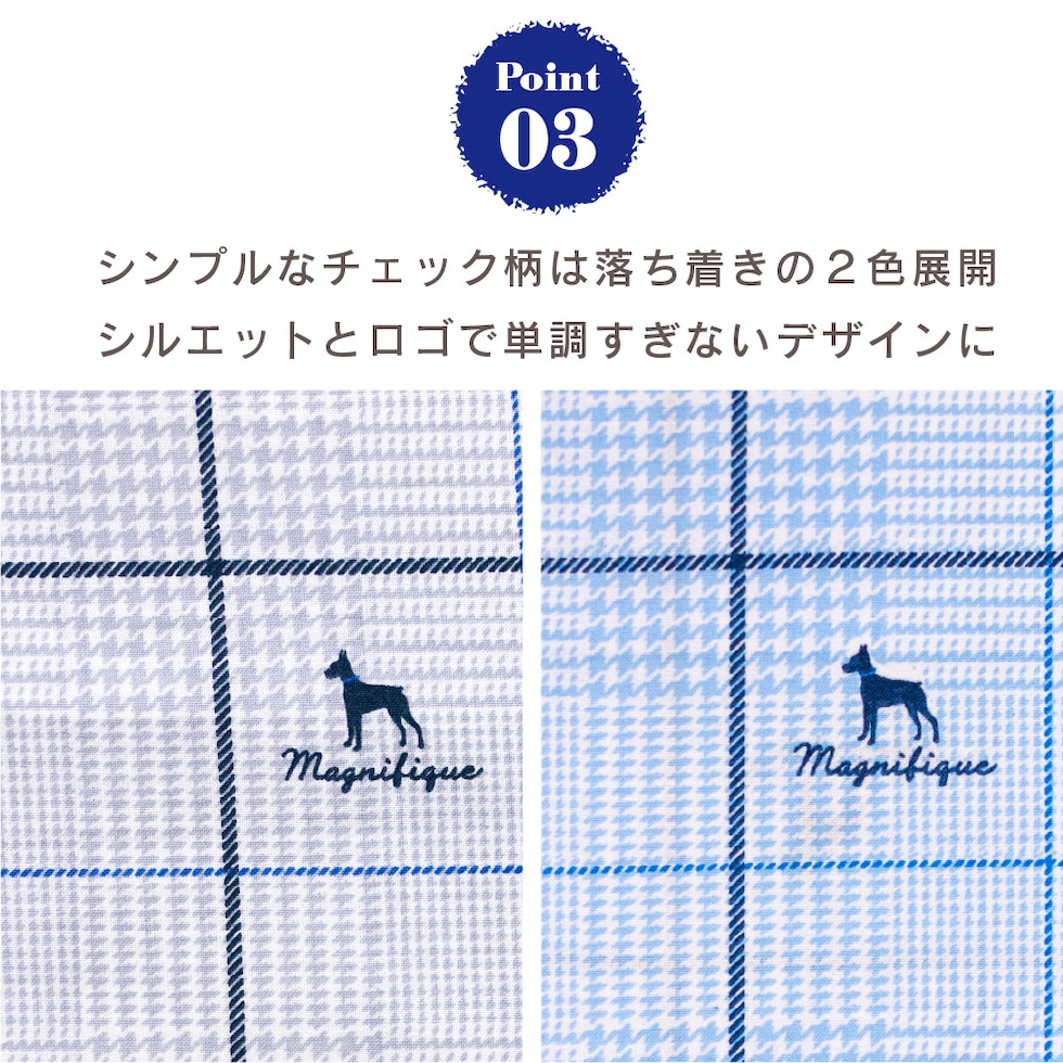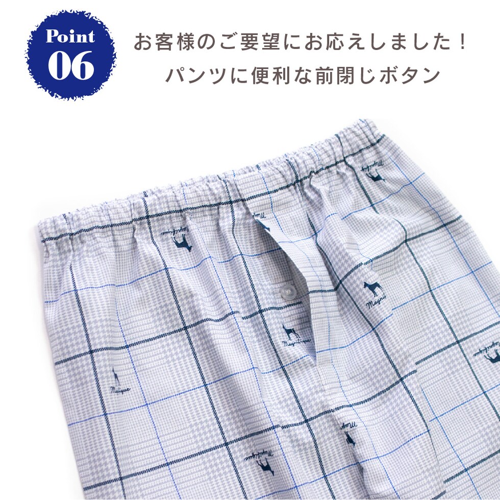 肌にやさしい綿100%がいいね ♪ 肌に直接触れるものだから、安心の天然素材でつくりました。 すっきりとした薄手の生地は軽く風通しもよく、 サラリとした肌触りが気持ちのいいパジャマです。 グレンチェック爽やかな色合いの犬柄パジャマです。 このパジャマは大きいサイズや半袖も販売しているので、そちらもオススメ! ▼ 同柄長袖パジャマ ▼ |