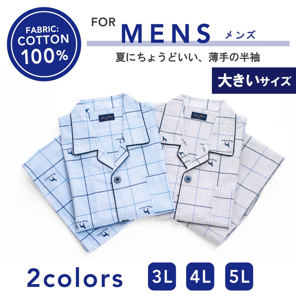 大きいサイズ パジャマ メンズ 綿100% 半袖 夏向け 前開き グレンチェック 犬柄 薄手のシャツ ブルー グレー 3L 4L 5L プレゼント 父の日
