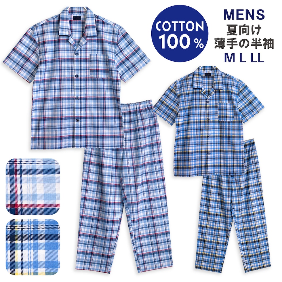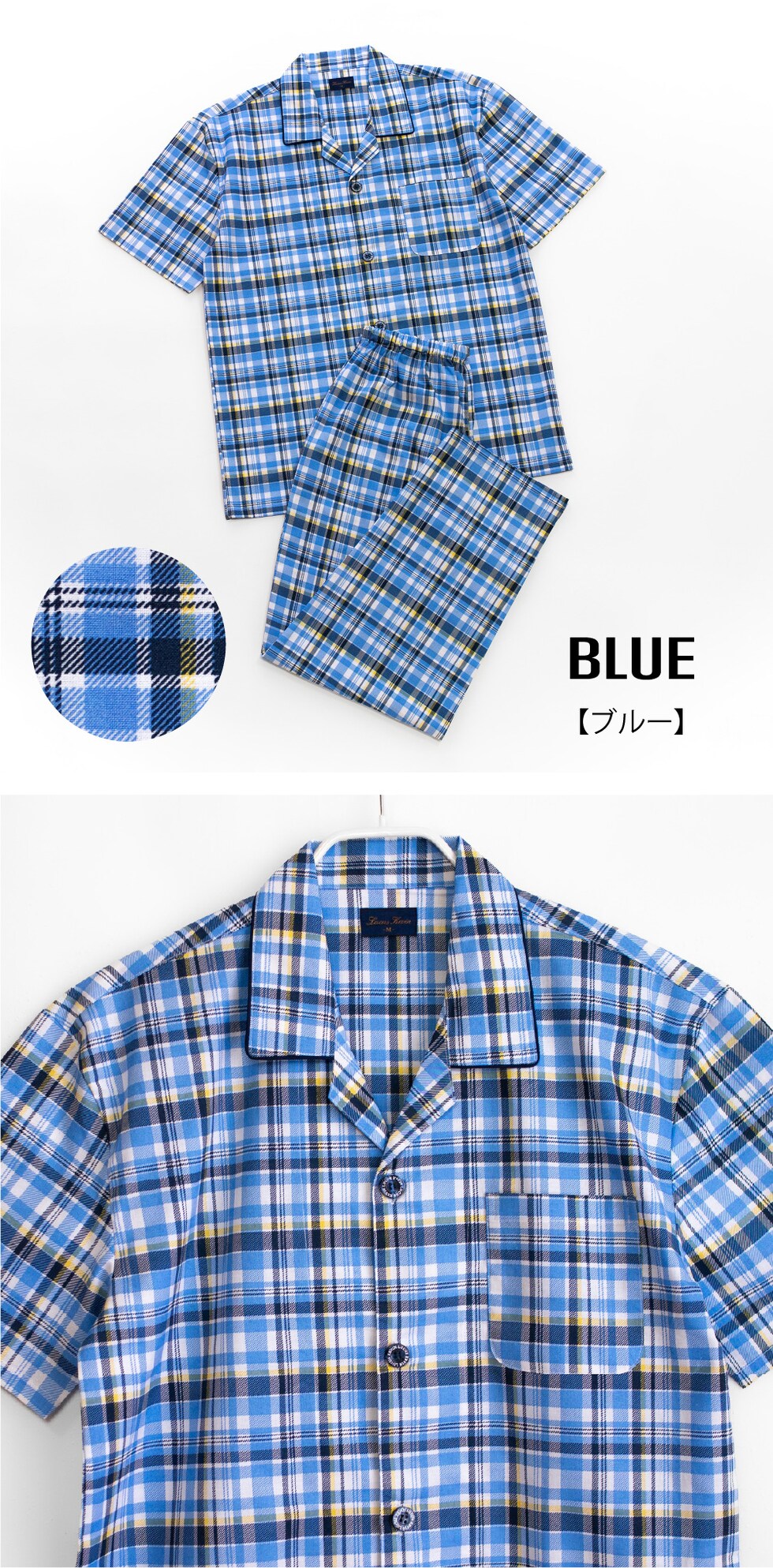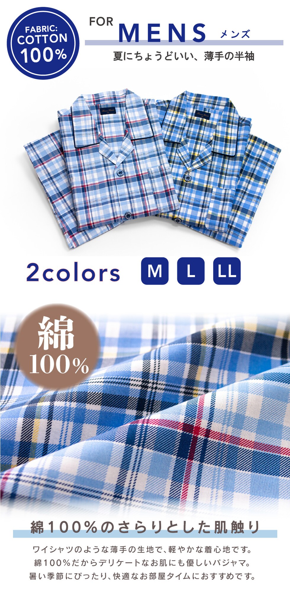 パジャマ メンズ 綿100% 半袖 夏向け 前開き チェック柄 薄手のシャツ ブルー サックス M L LL おそろい プレゼント 父の日